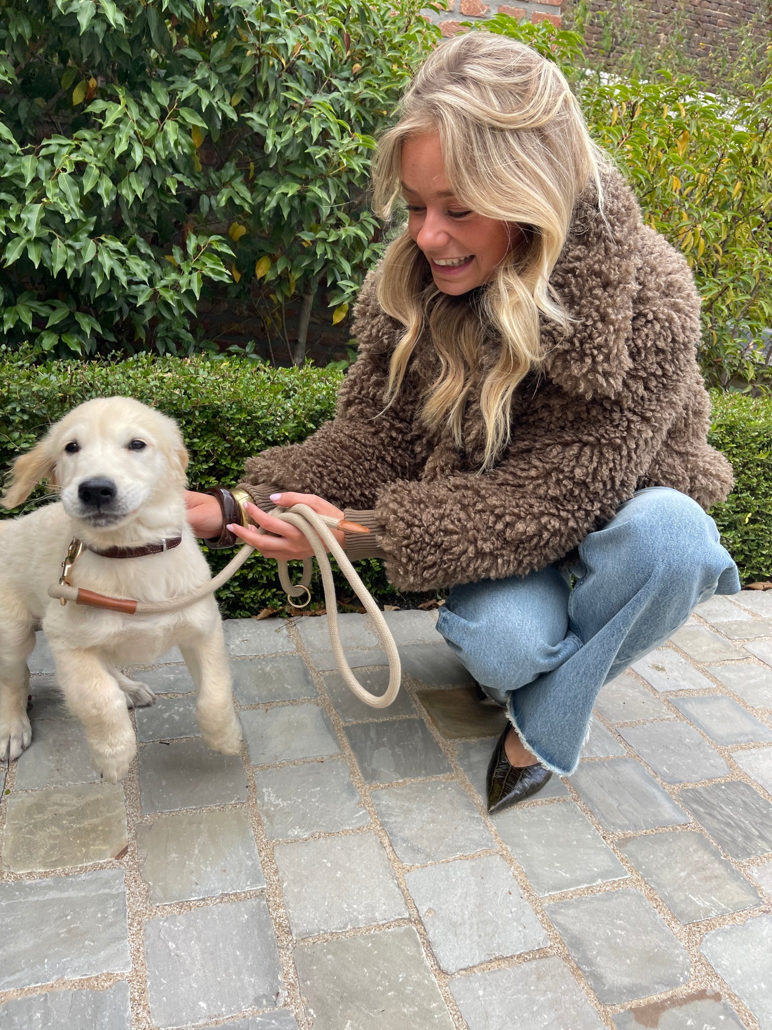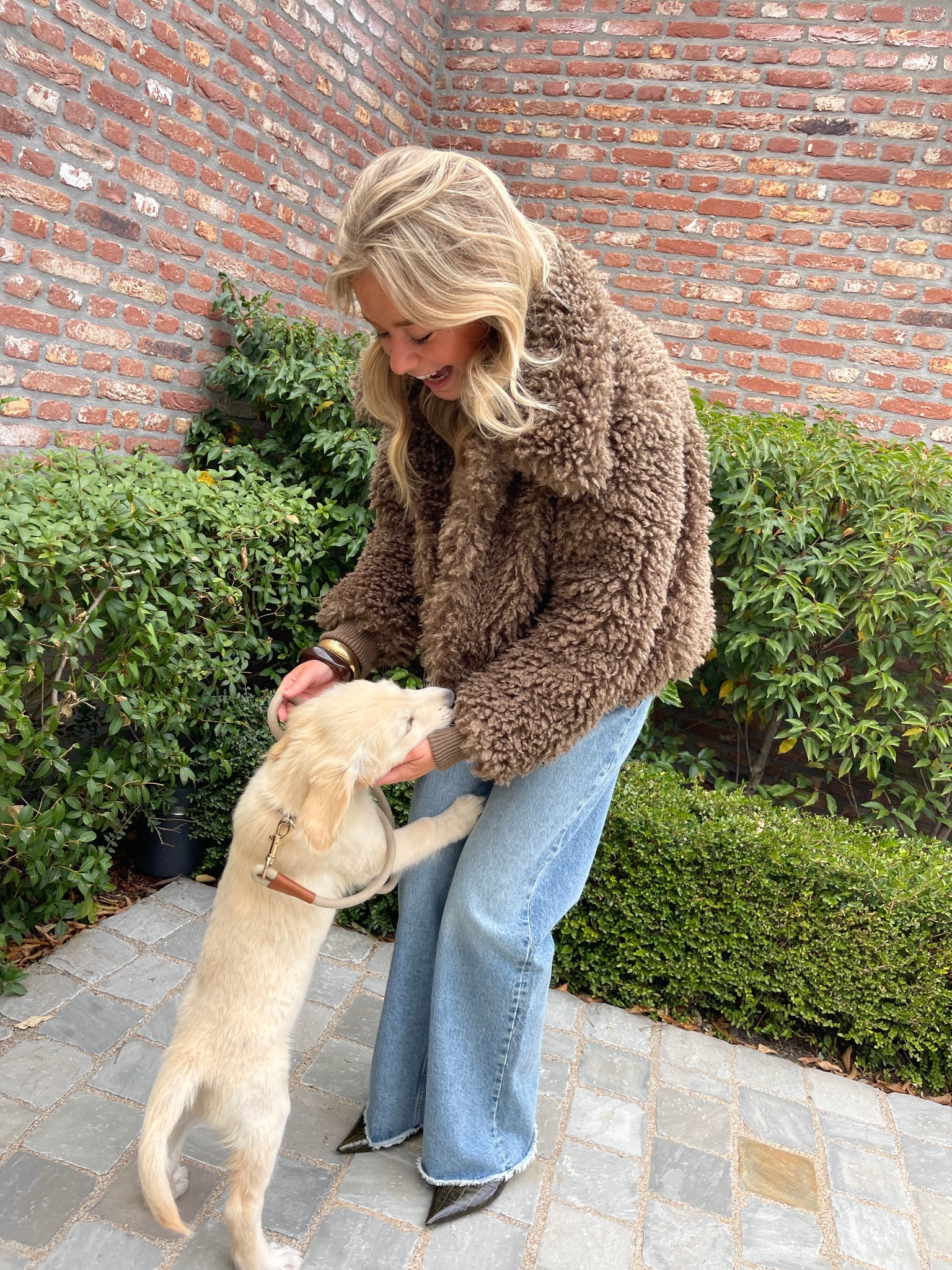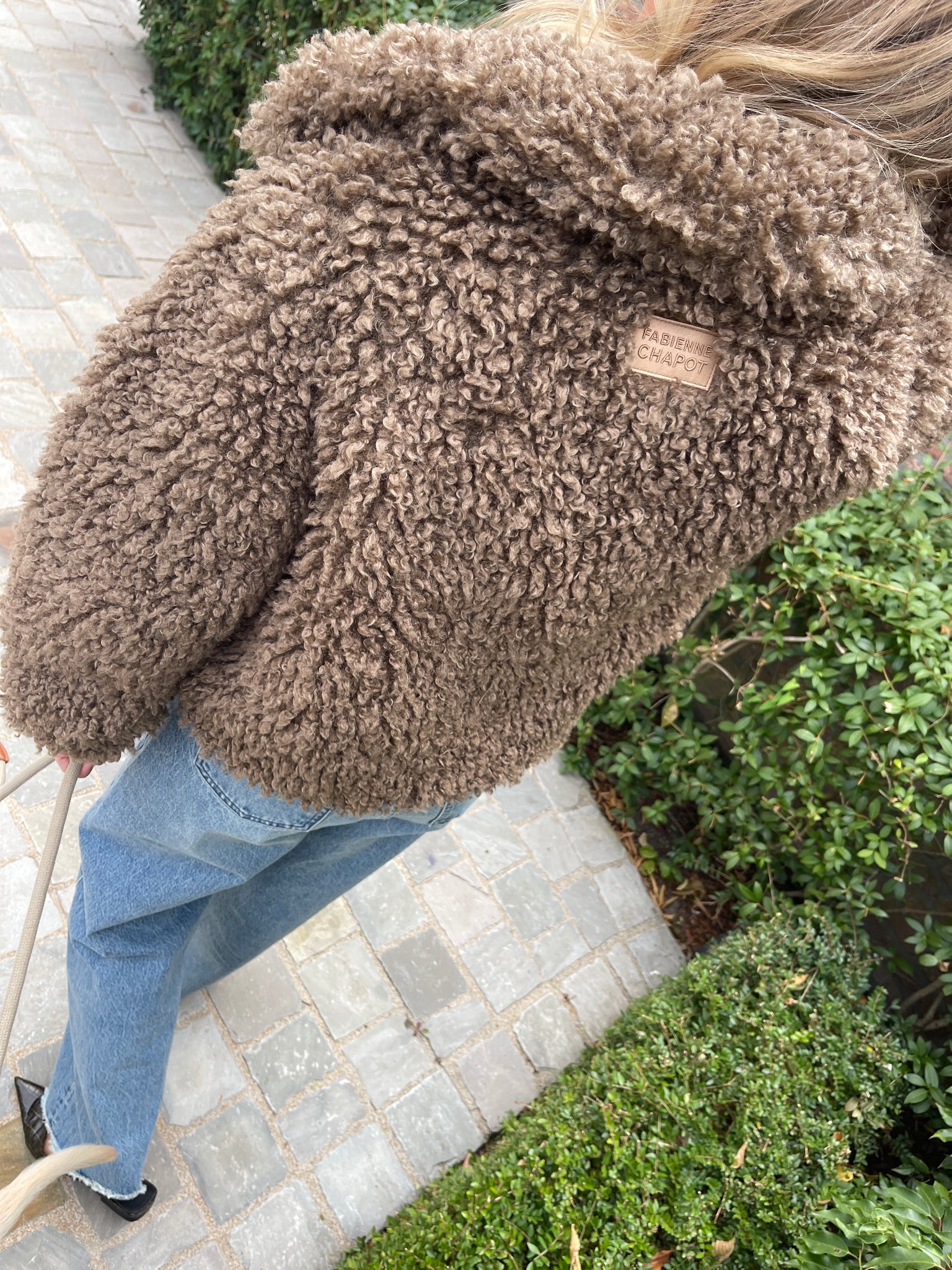 This fluffy teddy jacket in brown combines warmth and structure with an elastic waistband and cuffs for a snug fit. Finished with a classic collar and front button closure, it’s a cozy outer layer that balances comfort with a clean, casual look.