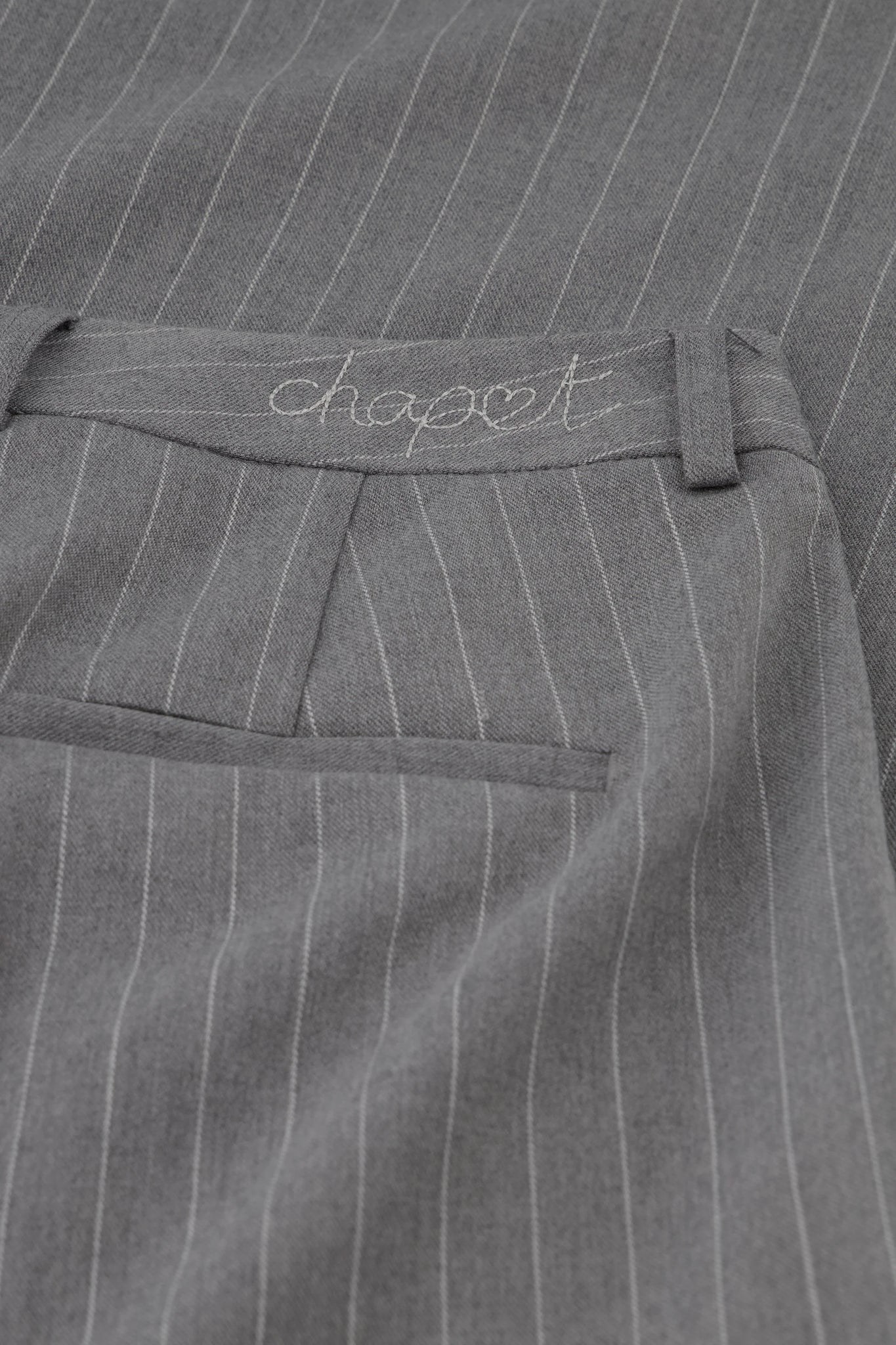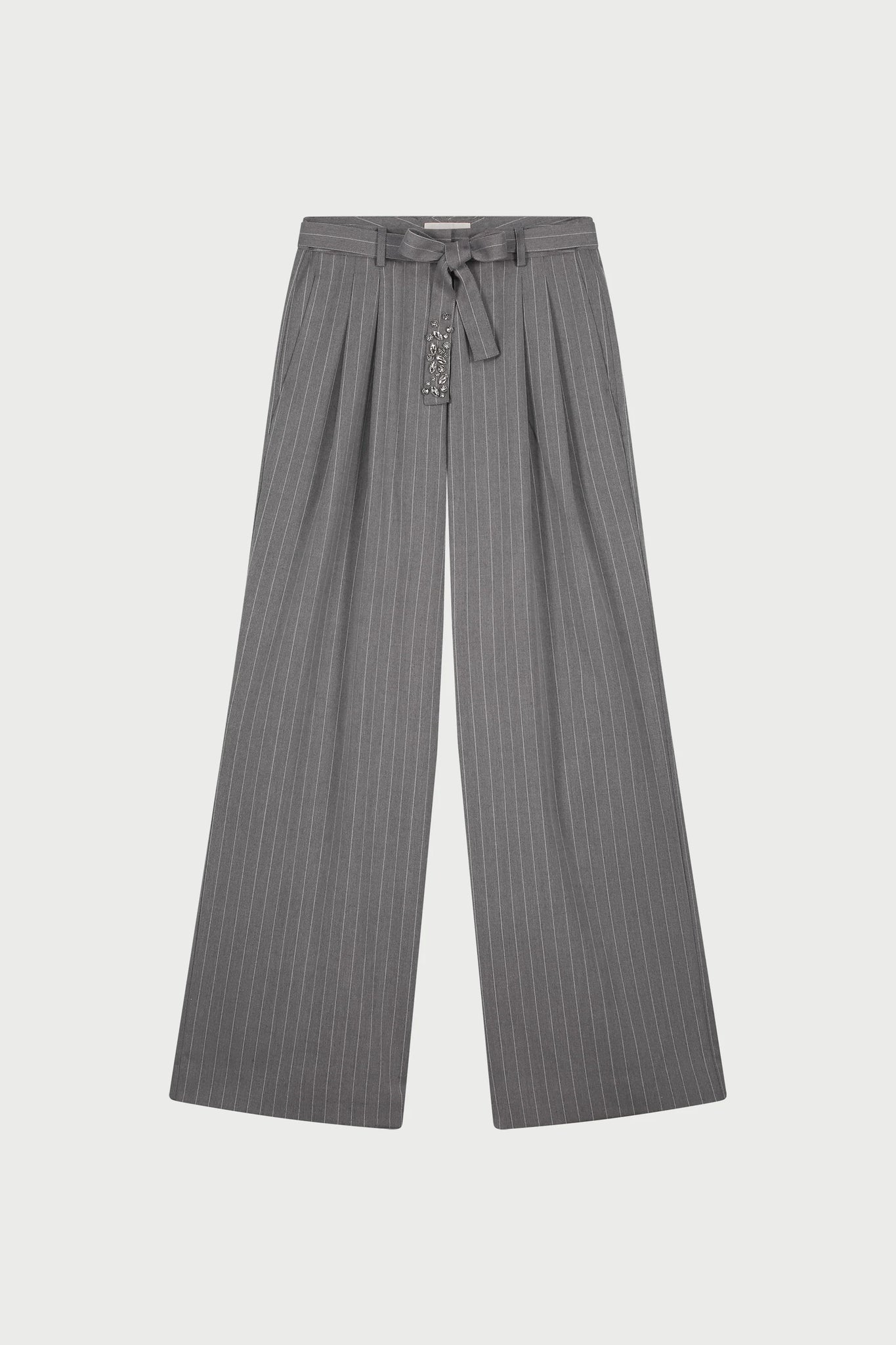 These grey fabric pants feature subtle vertical stripes and a drawstring belt adorned with sparkling stones as a special detail. Their loose fit makes them comfortable to wear. Pair them with a simple T-shirt for an elegant yet sporty look