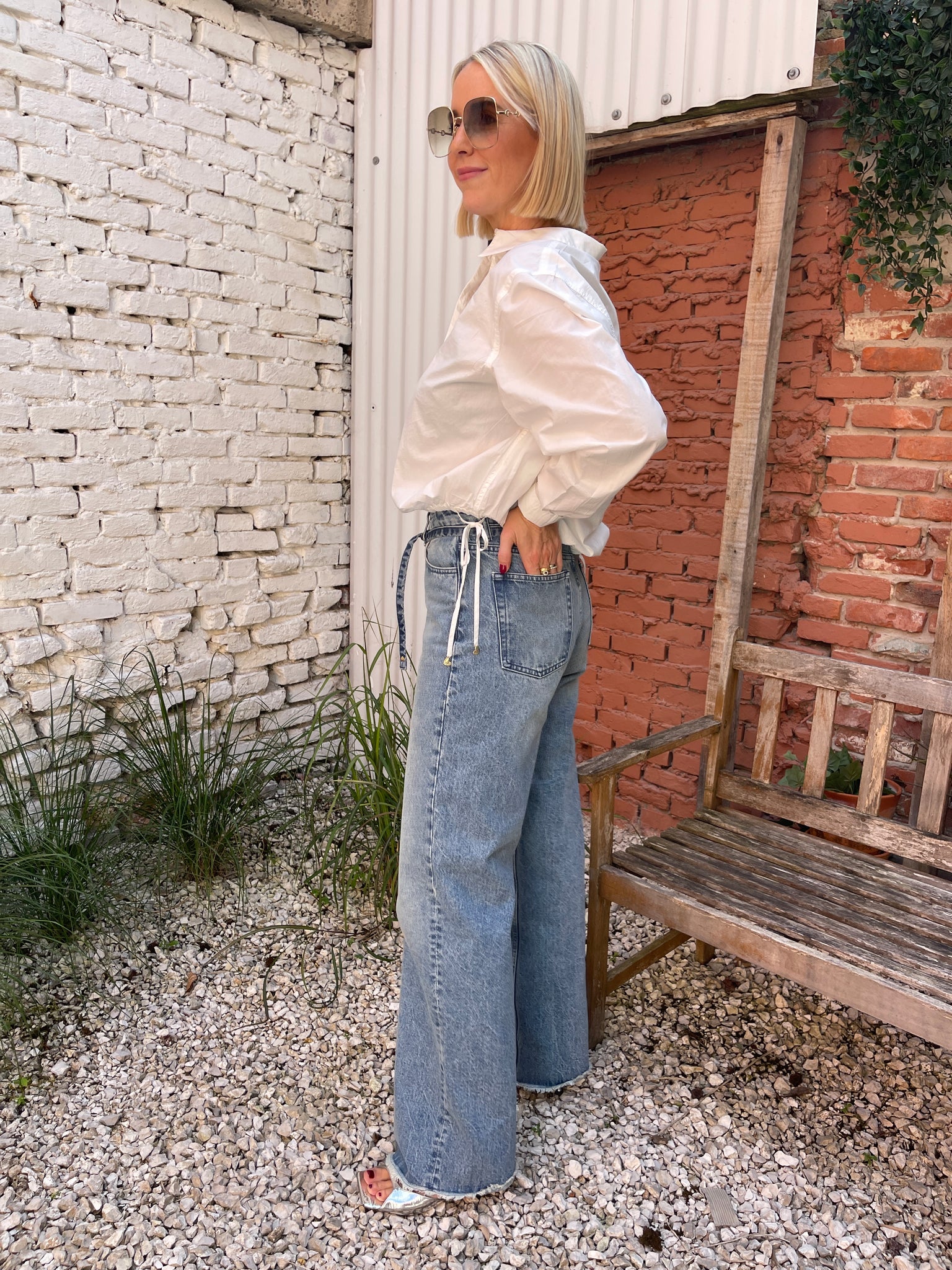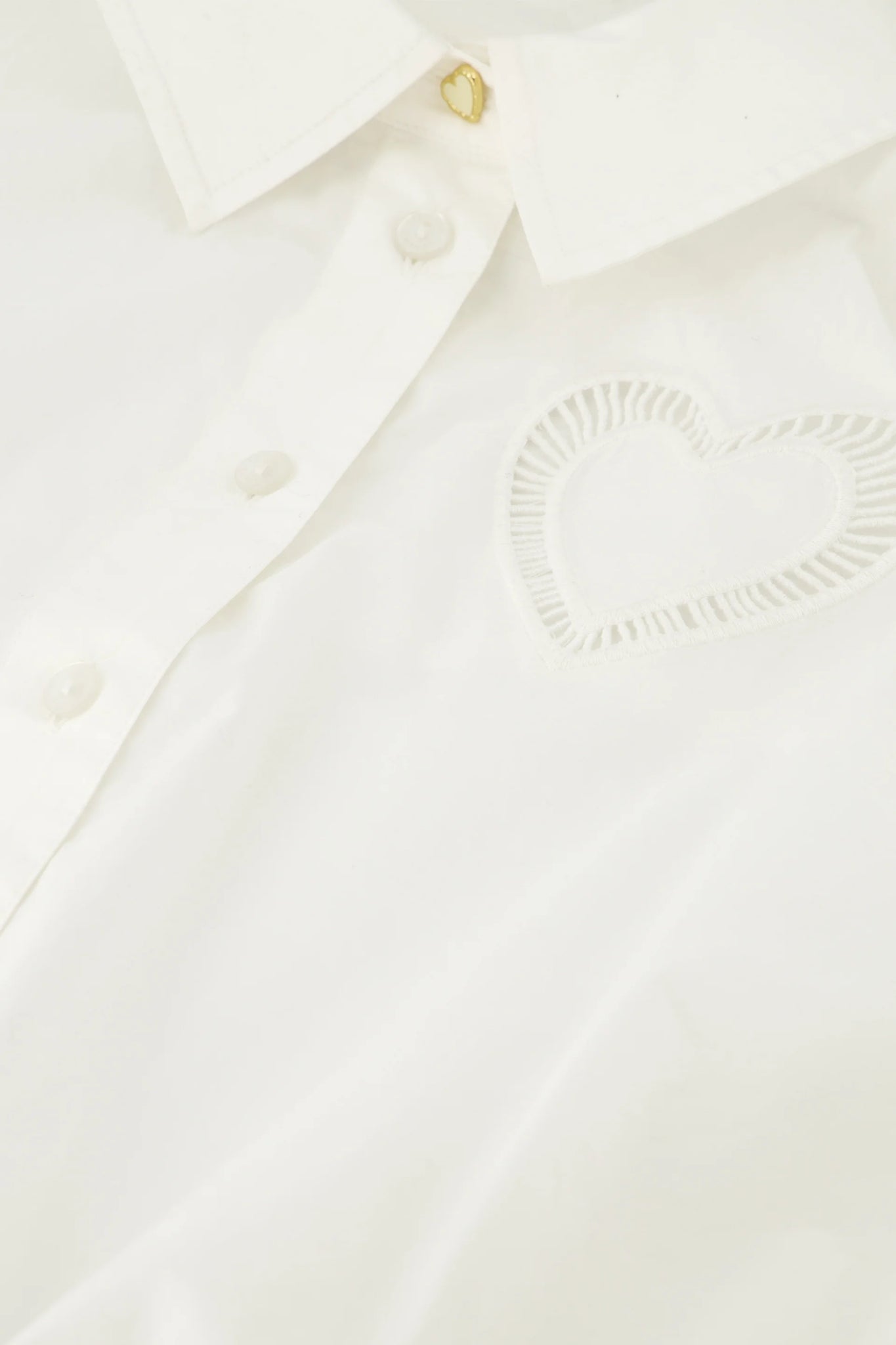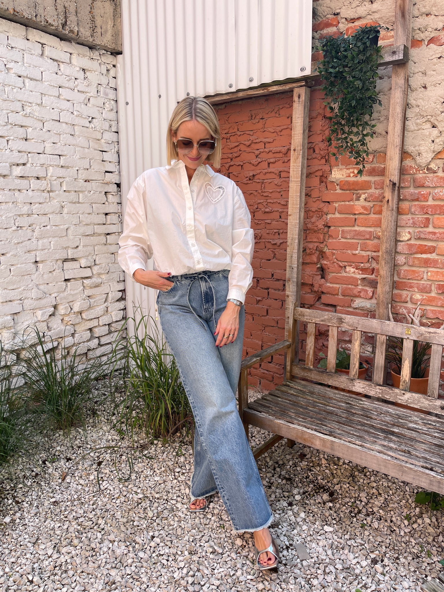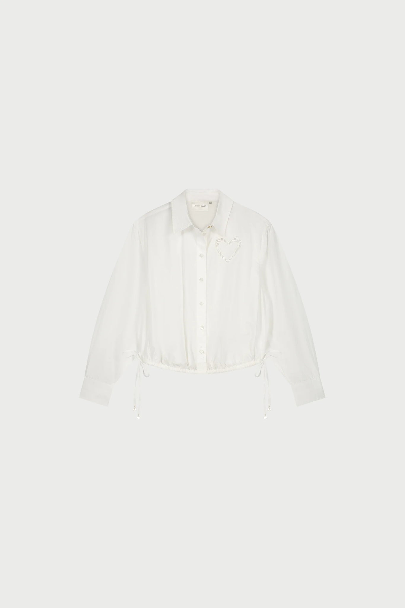 This white long-sleeved blouse features a classic design with charming details. It comes with a standard collar and an elasticated hem, allowing for an adjustable fit. A small heart embroidery on the front adds a playful touch. Made from 100% cotton, which makes it soft, breathable, and comfortable to wear.