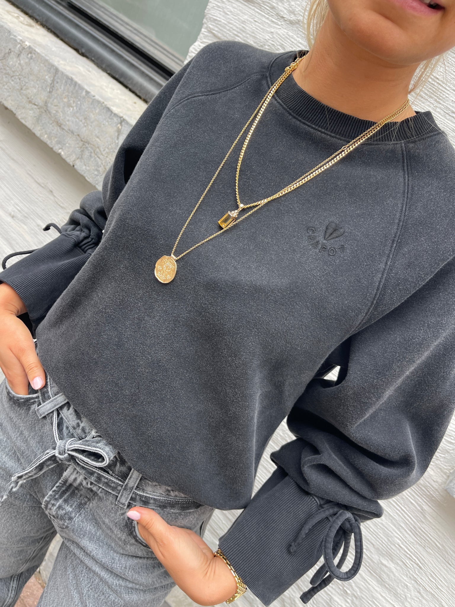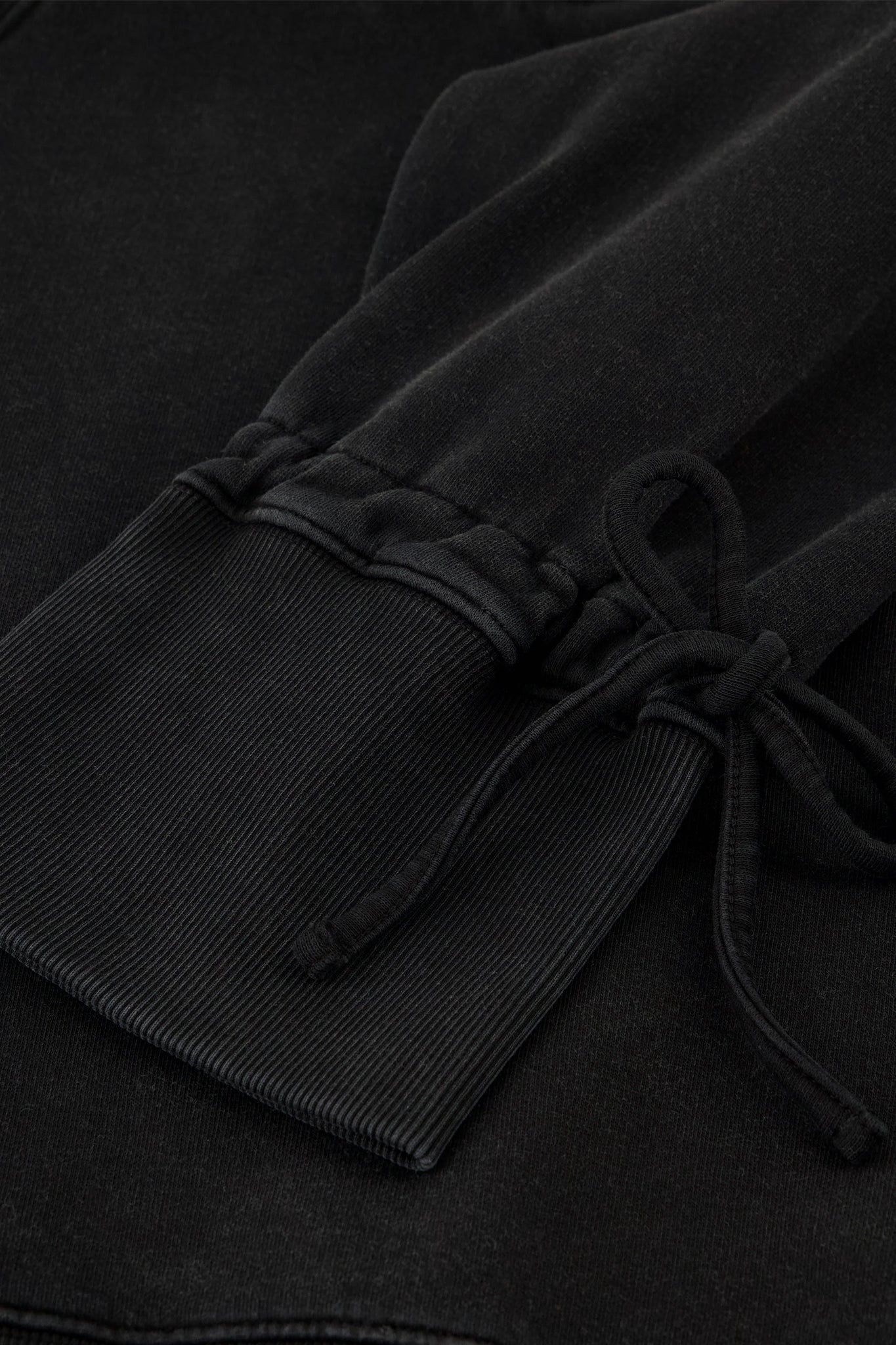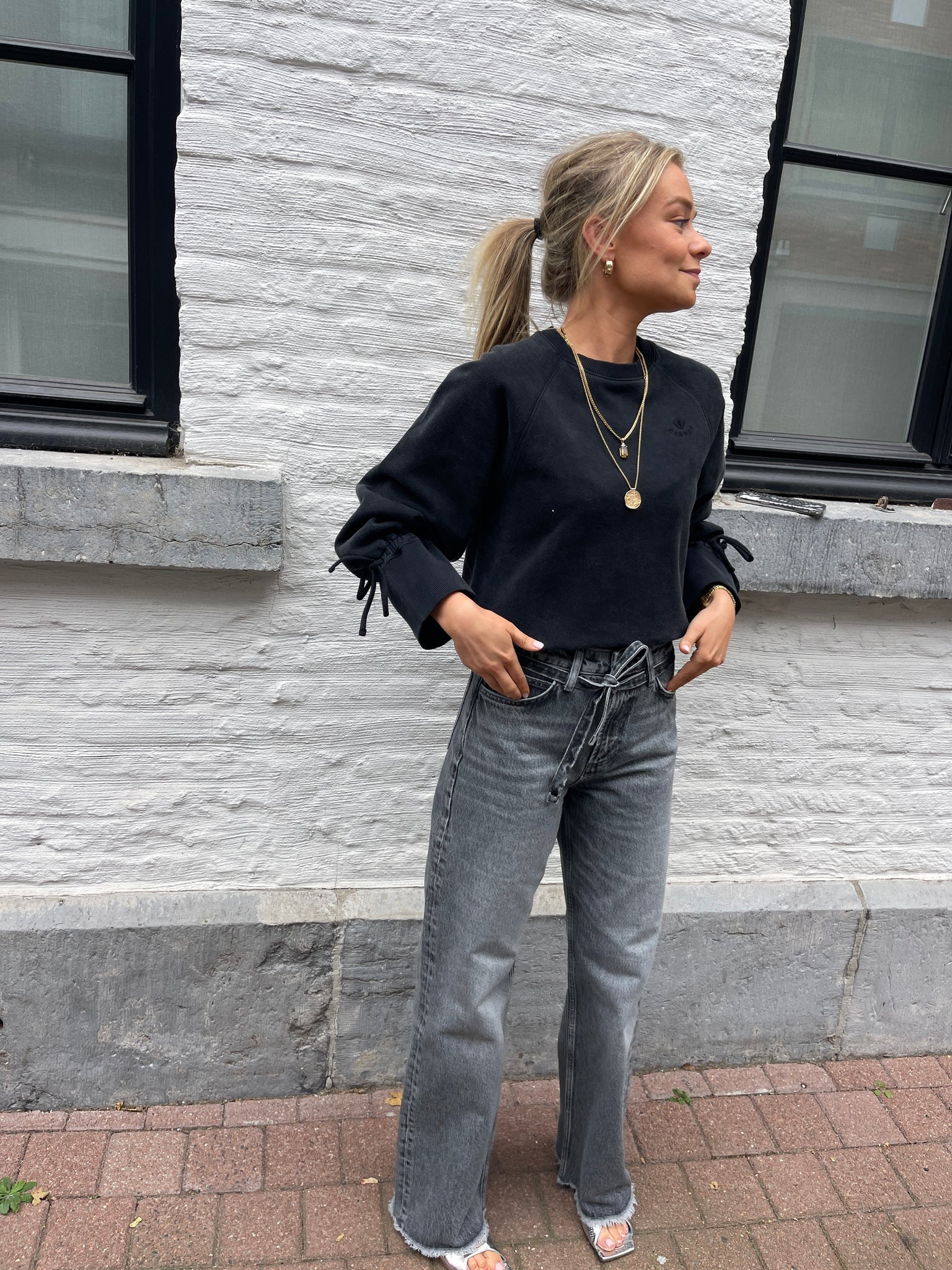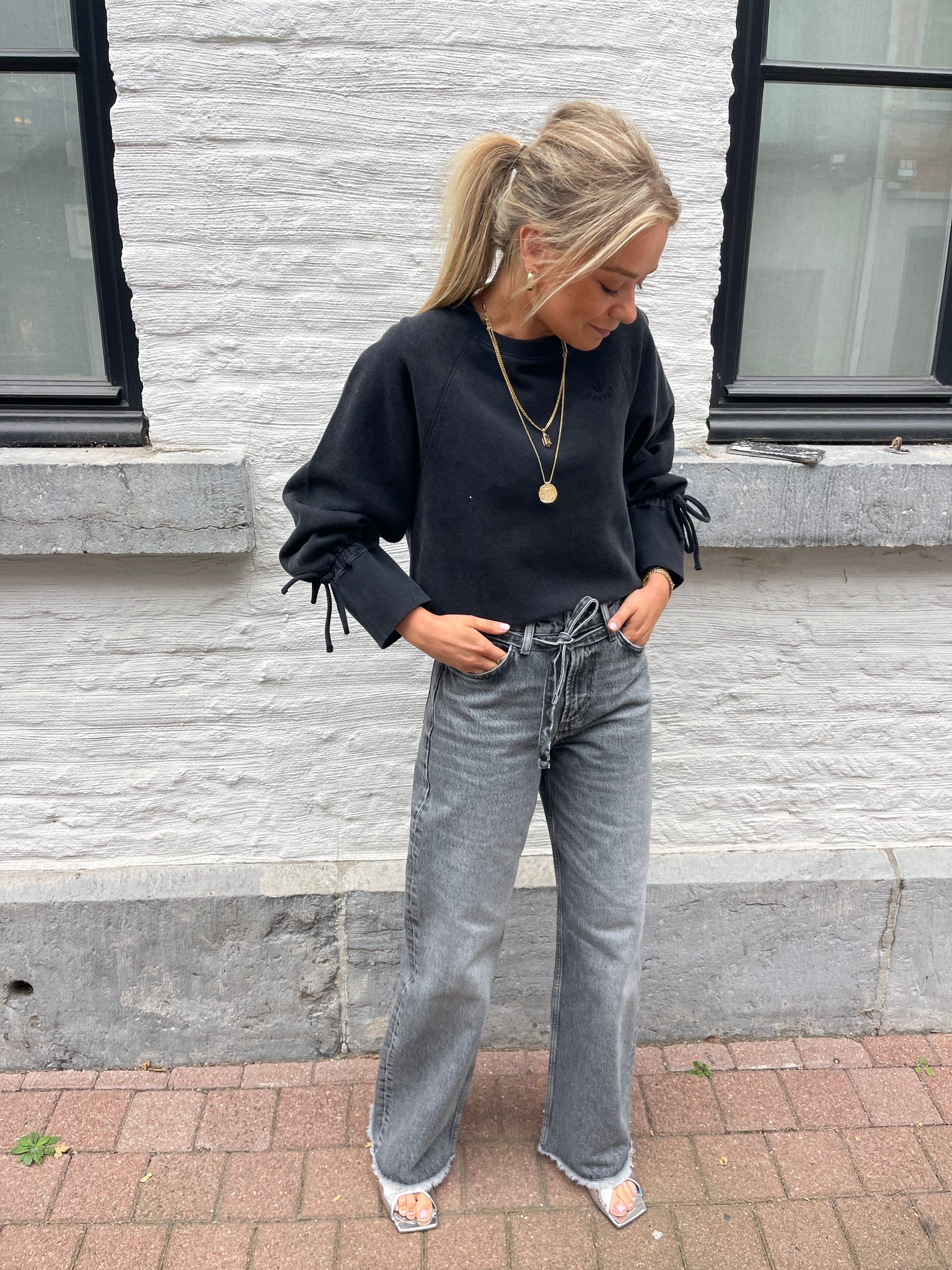 This black sweater is made from 100% organic cotton, offering comfort and a pleasant wearing feel. At the cuffs, it has the option to cinch the sweater tighter and is decorated with playful bows. Pair it as you wish for any occasion, whether casual or a bit more elegant.
